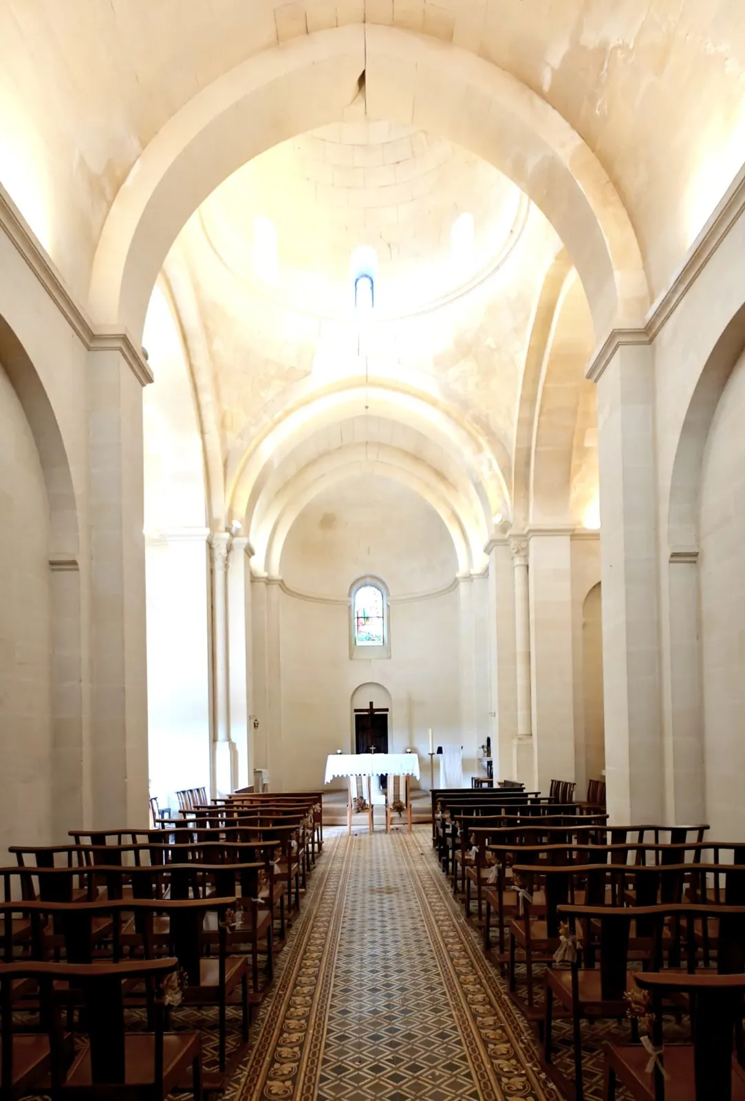 Elle est posée au milieu des vignes, avec son style néo-roman assumé et son élégant clocher surmontant le dôme central.