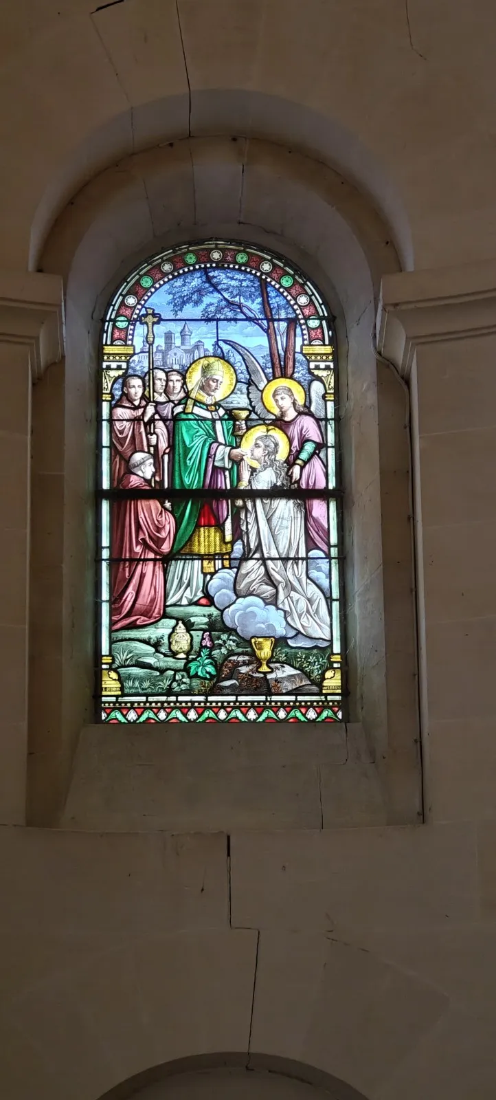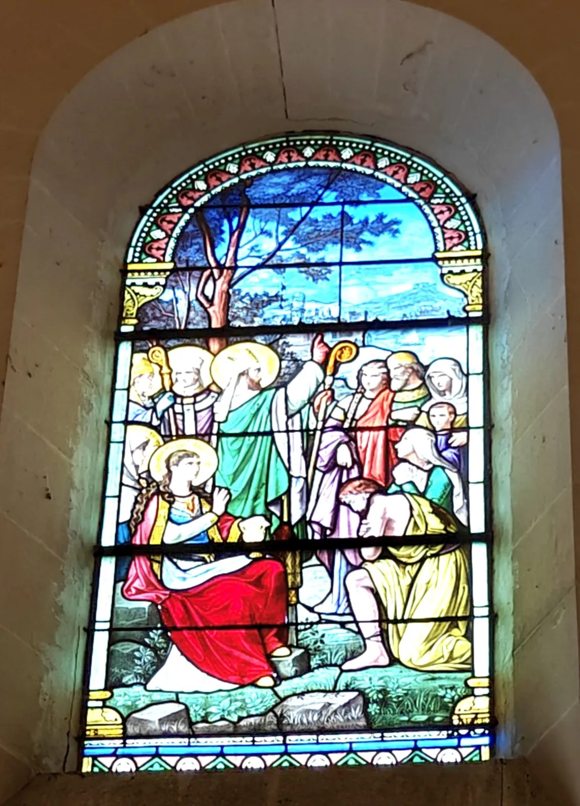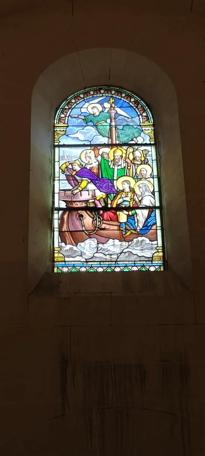 Sobre : seuls les chapiteaux sculptés des colonnes, et les vitraux signés Édouard Didron (1886) illustrant la vie de saint Lazare, apportent un peu d’âme.