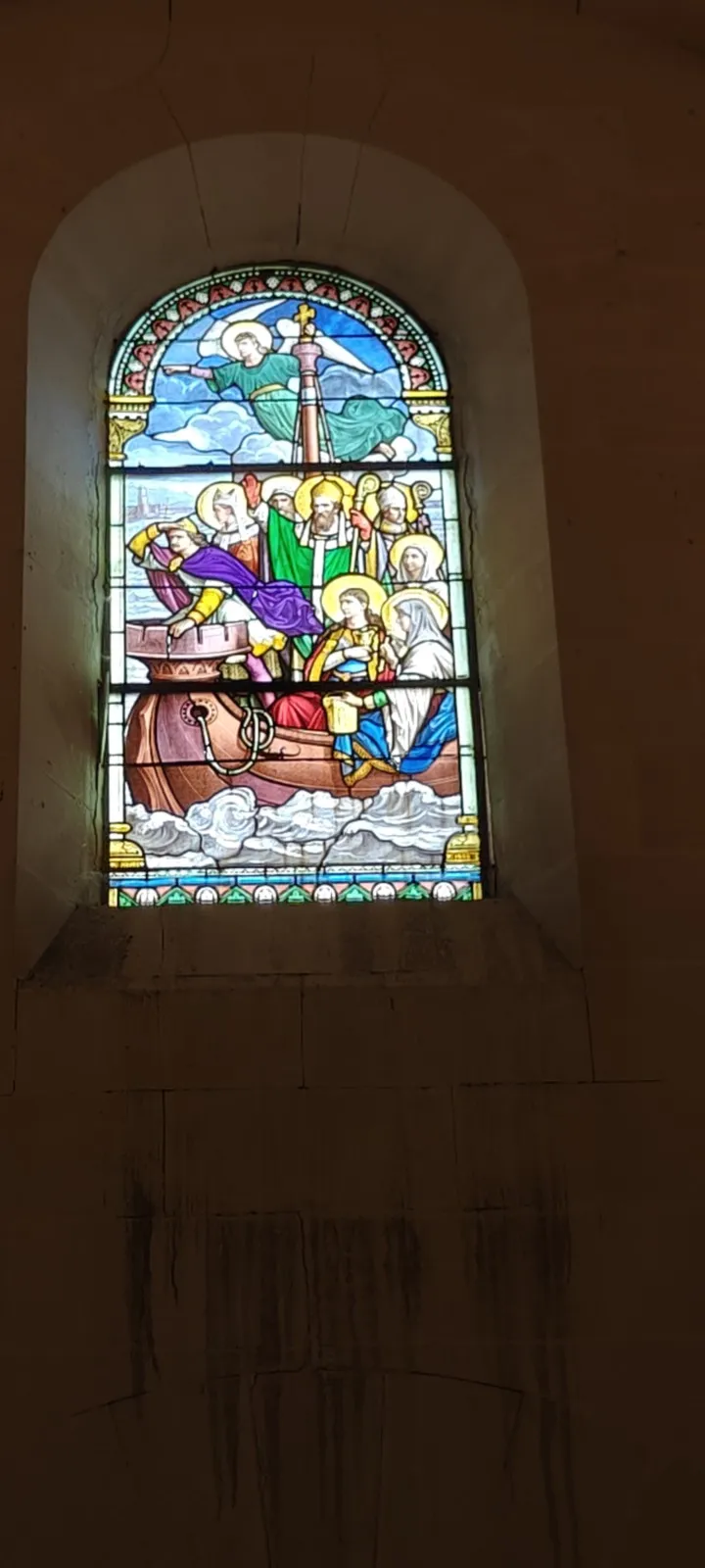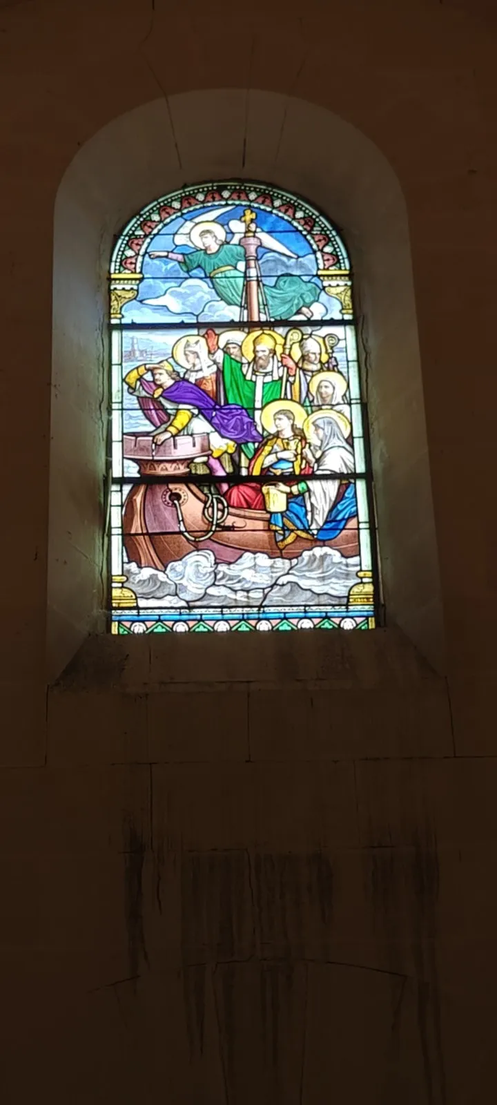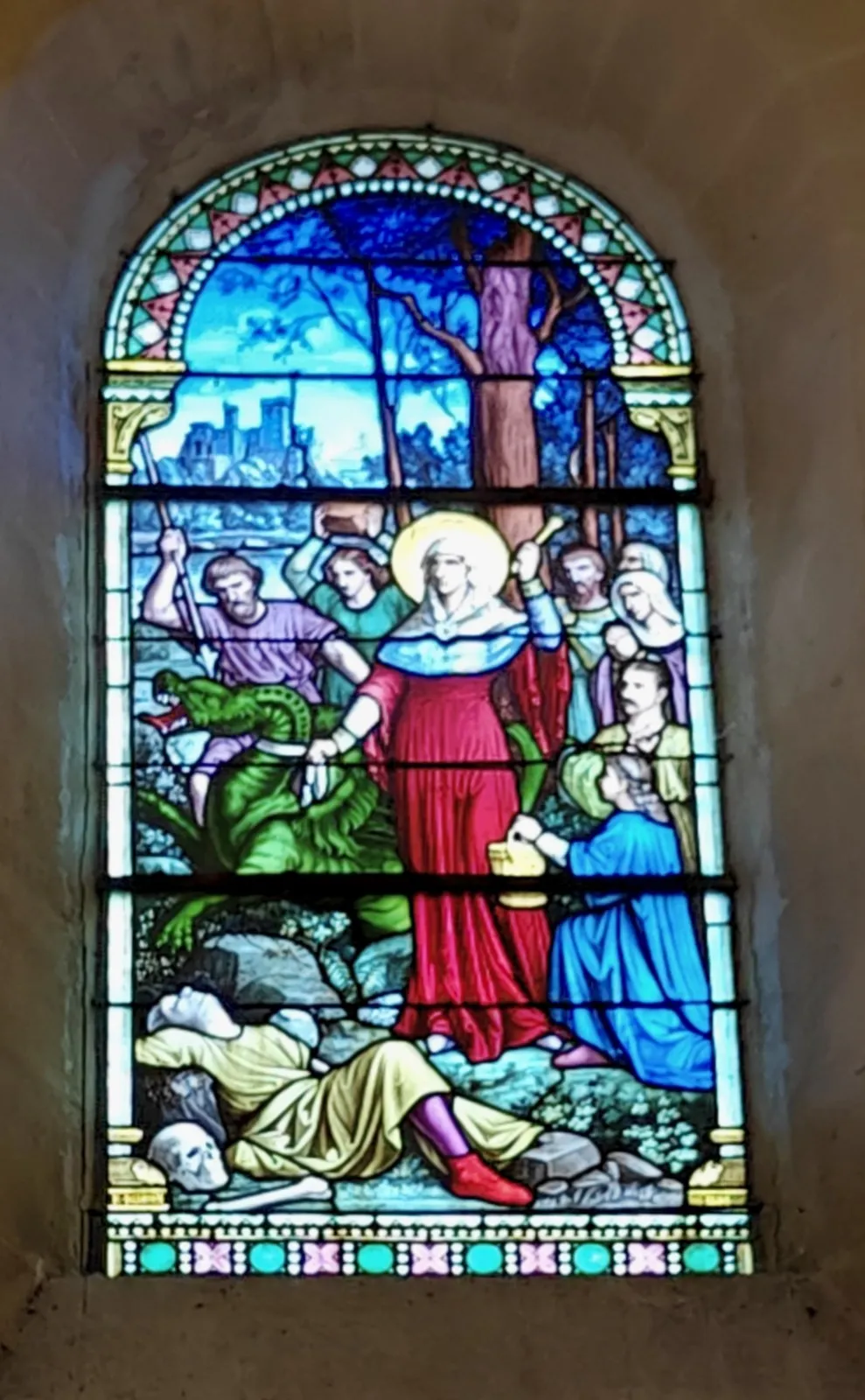 Sobre : seuls les chapiteaux sculptés des colonnes, et les vitraux signés Édouard Didron (1886) illustrant la vie de saint Lazare, apportent un peu d’âme.